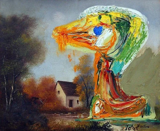Danish artist Asger Jorn’s Modifications form a crucial pre-Daubist precedent. Jorn painted wild, expressionist figures and marks onto anonymous landscape paintings found in flea markets, gleefully vandalising bourgeois taste. Daubism echoes this interference but shifts the emphasis: where Jorn sought anarchic revolt, Daubism pursues a layered palimpsest—Australia’s art histories, pop culture, politics, Indigenous motifs and personal mythology stacked on top of one another.