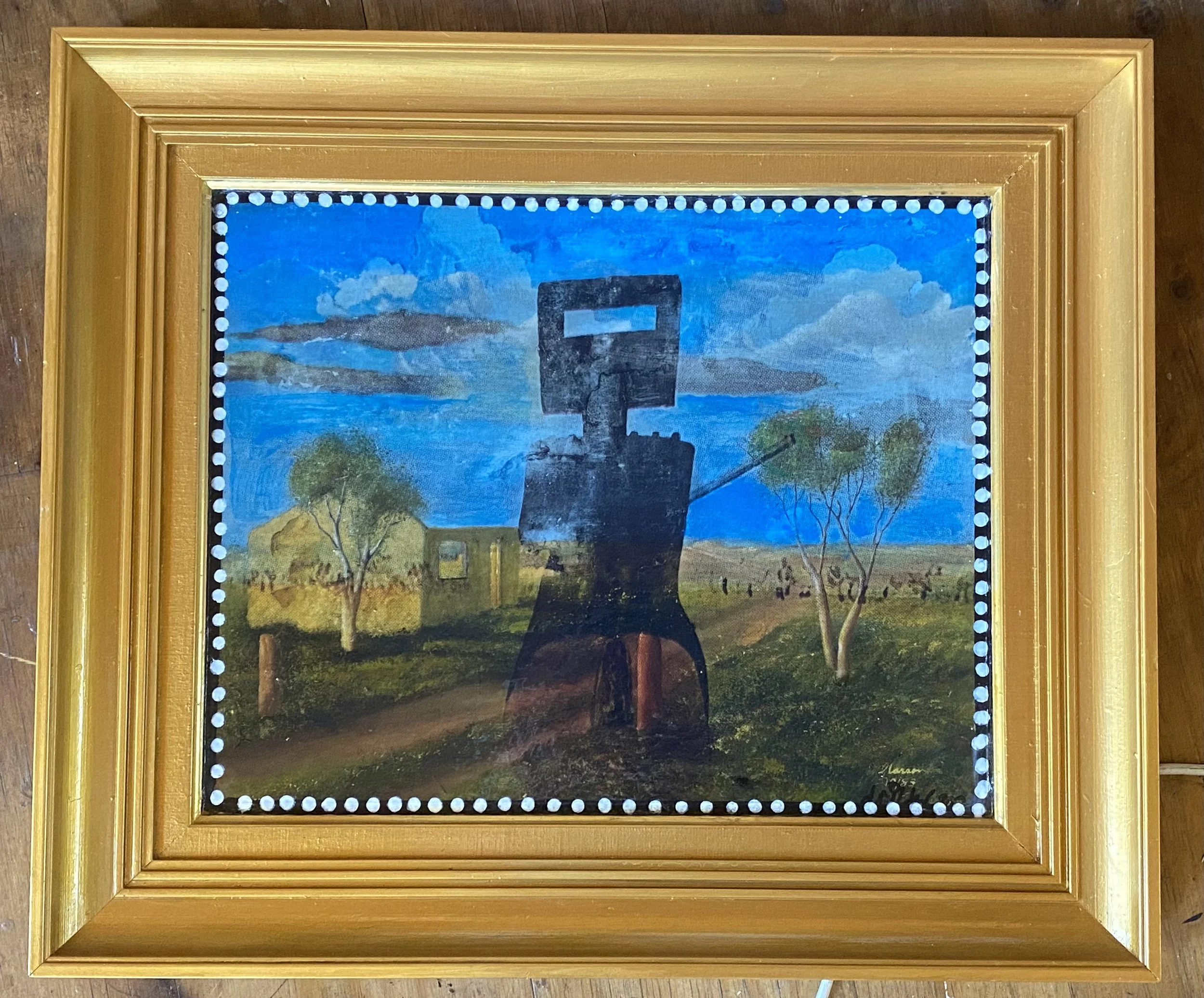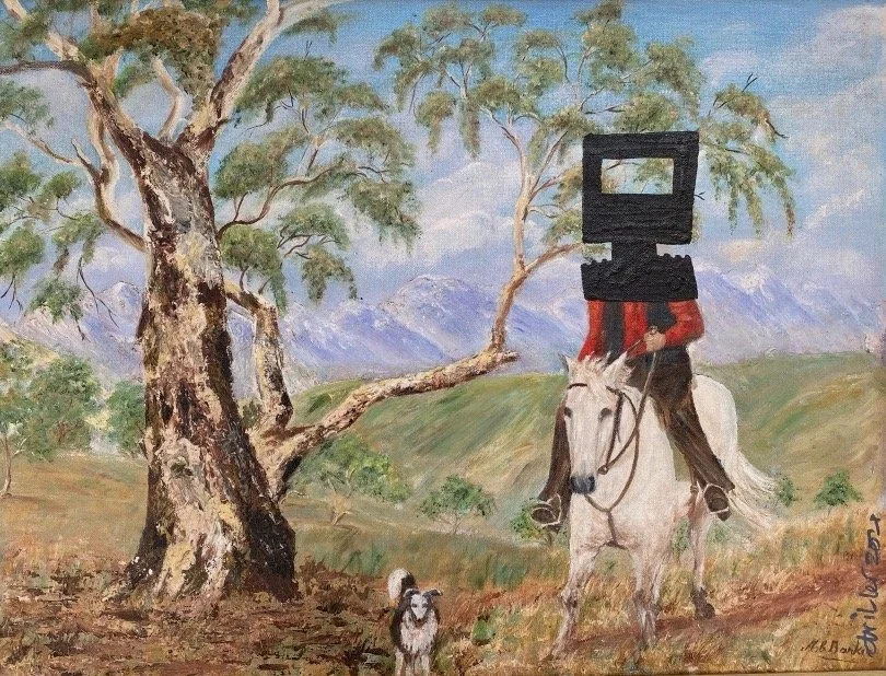 Here, Nolan’s square-headed outlaw no longer rides through expressionist scrub but into the decorative, settler-fantasy bushland typical of mid-century amateur painting. By grafting the iconic Ned Kelly mask directly onto an existing landscape, Armstrong performs a double appropriation: he borrows from Nolan, who himself borrowed from the myths of frontier violence, and inserts that image into a substrate soaked in colonial nostalgia.