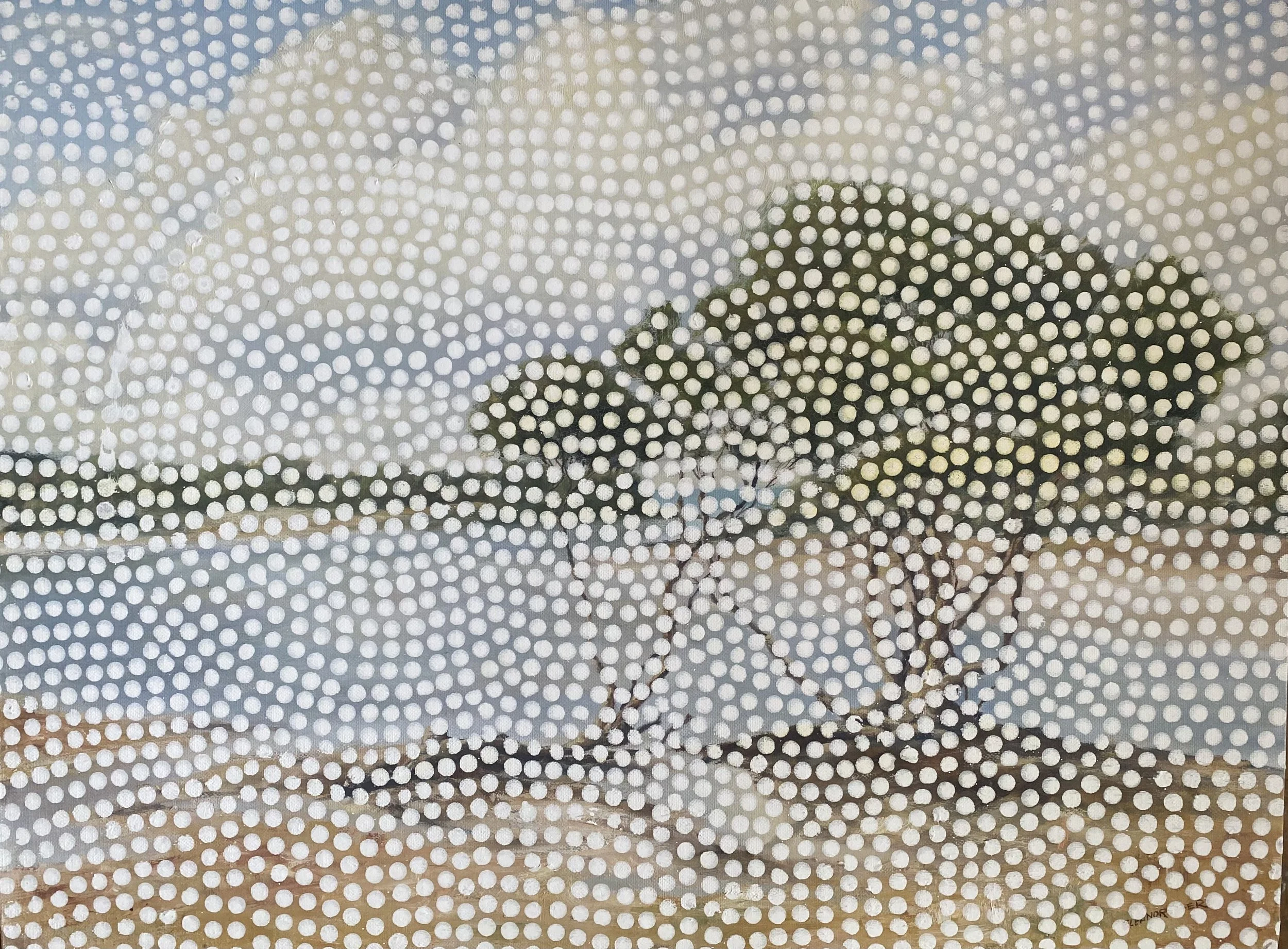 The underlying landscape is not erased but recalibrated. Trees, sky, water and horizon remain visible through the daubed field, visually negotiating for space. The work becomes a site of encounter: two traditions occupying the same surface without collapsing into one another.