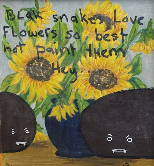 In Blak Snakes Love Flowers, Armstrong detonates the genteel stability of the traditional still-life—a genre historically obsessed with purity, beauty, and order—by allowing his cartoon-like “blak snakes” to literally speak back. Their warning (“best not paint them, hey…”) functions as both a mischievous punchline and a cutting meta-critique of artistic entitlement.