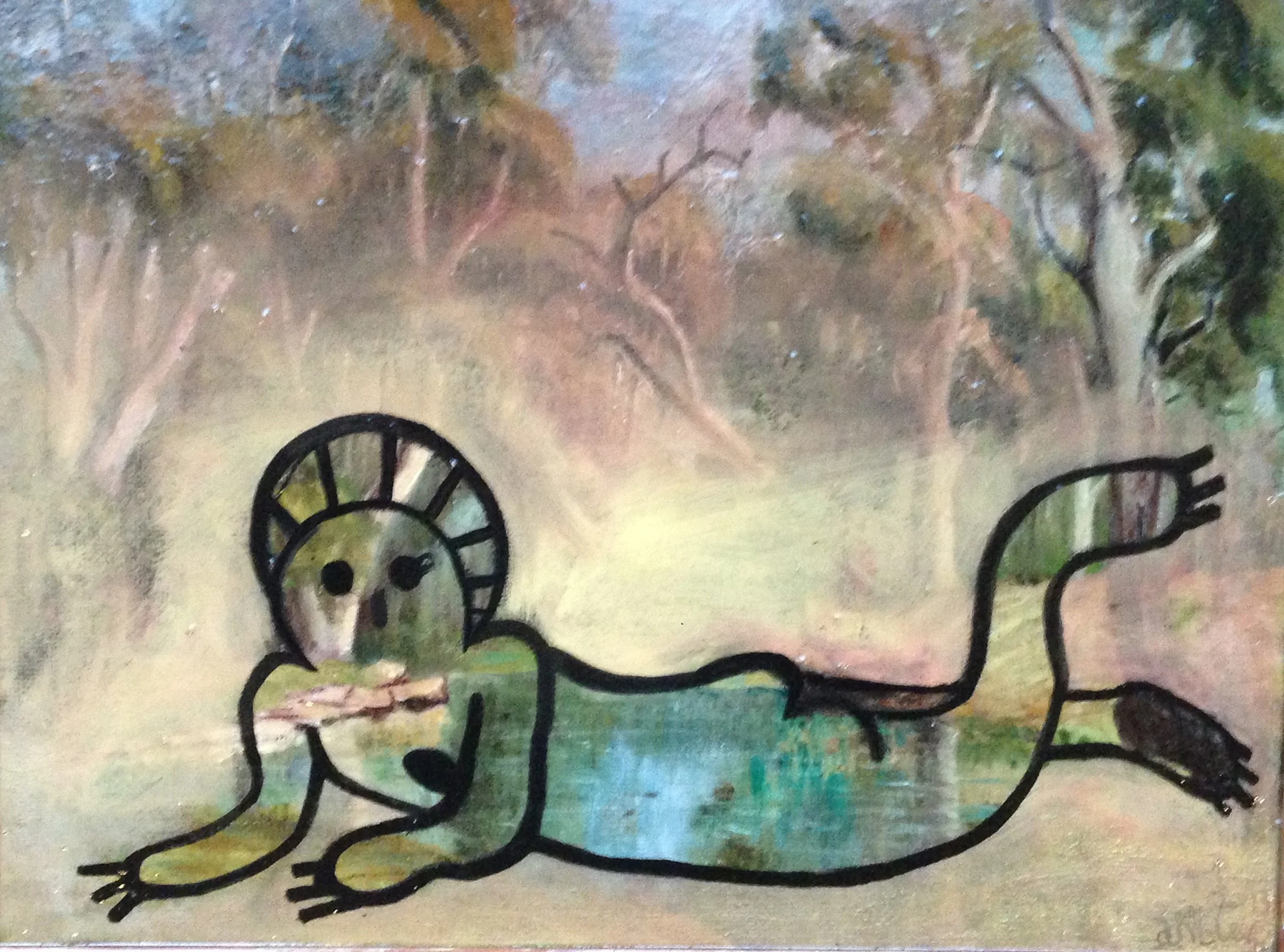 A Daubist work combining stylised Wandjina, Keith Haring iconography, and an original landscape painting