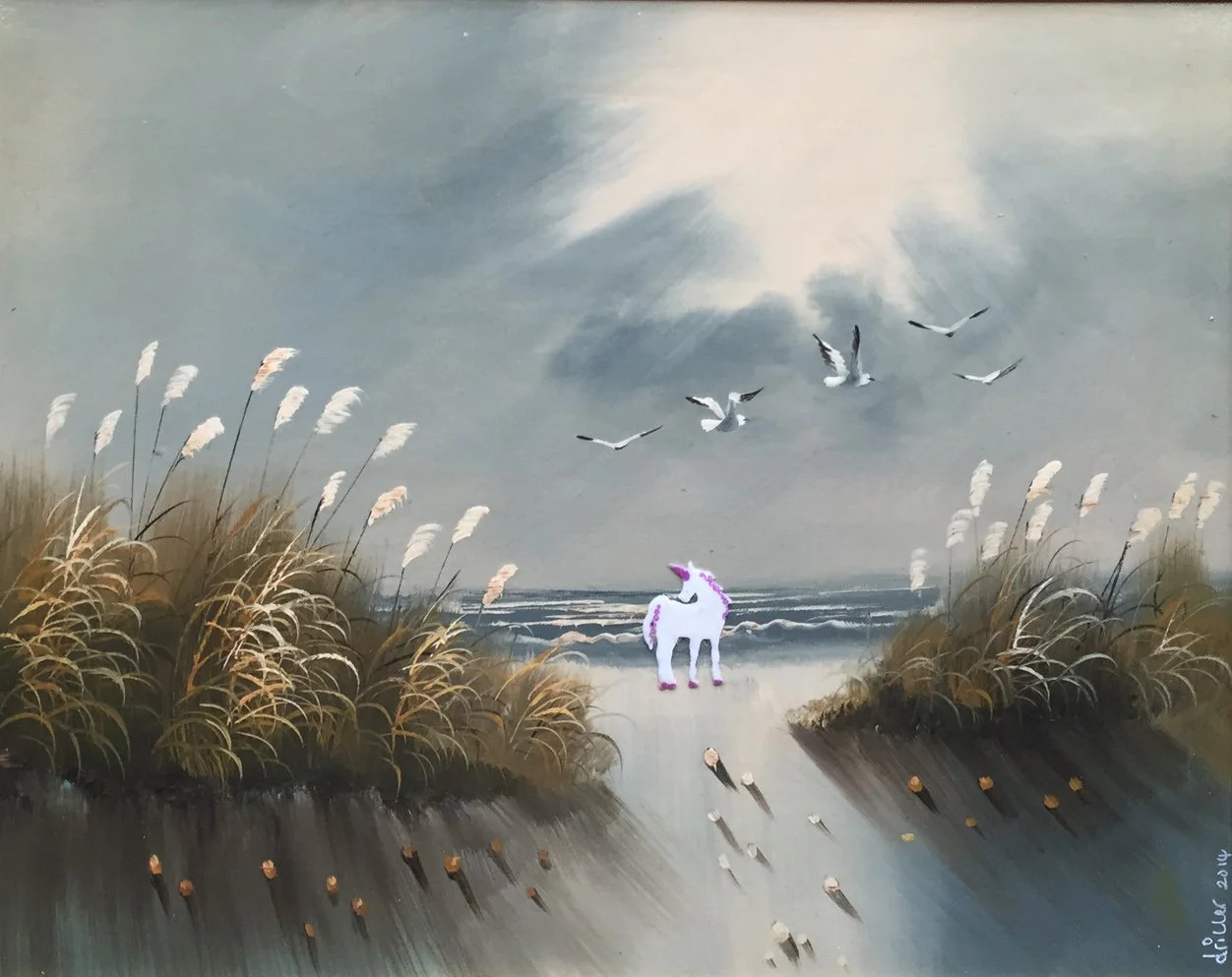 A sombre, windswept seascape—grey sky, drifting reeds, gulls suspended in unsettled air—serves as the stage for an intervention straight from the height of 2015 pop-culture: the glitter-era unicorn. In the mid-2010s the unicorn was everywhere—Instagram filters, novelty stationery, ironic T-shirts, rainbow lattes—an emblem of mass-produced whimsy and digitally amplified optimism.