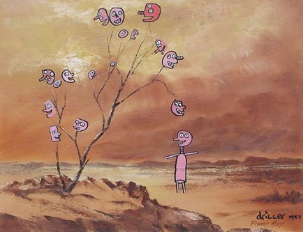 One of the early, foundational gestures of Daubism, Basquiat Daub (2002) takes a quiet, desolate Australian landscape and electrifies it with a burst of borrowed visual life. Onto a barren tree—lifeless, skeletal, almost forgotten—Driller grafts a constellation of Basquiat-inspired heads, cartoonish and impulsive, hanging like strange pink fruit.