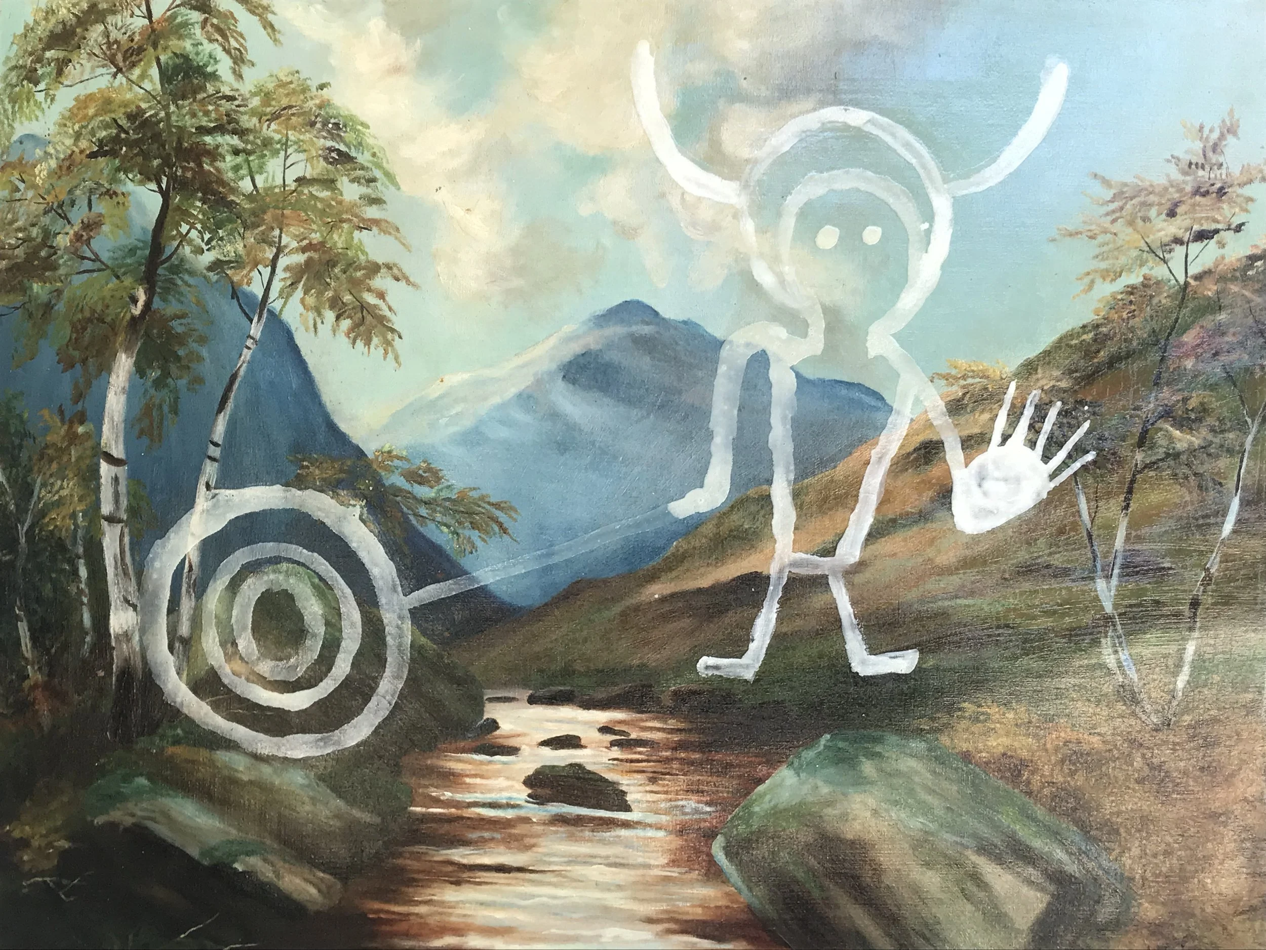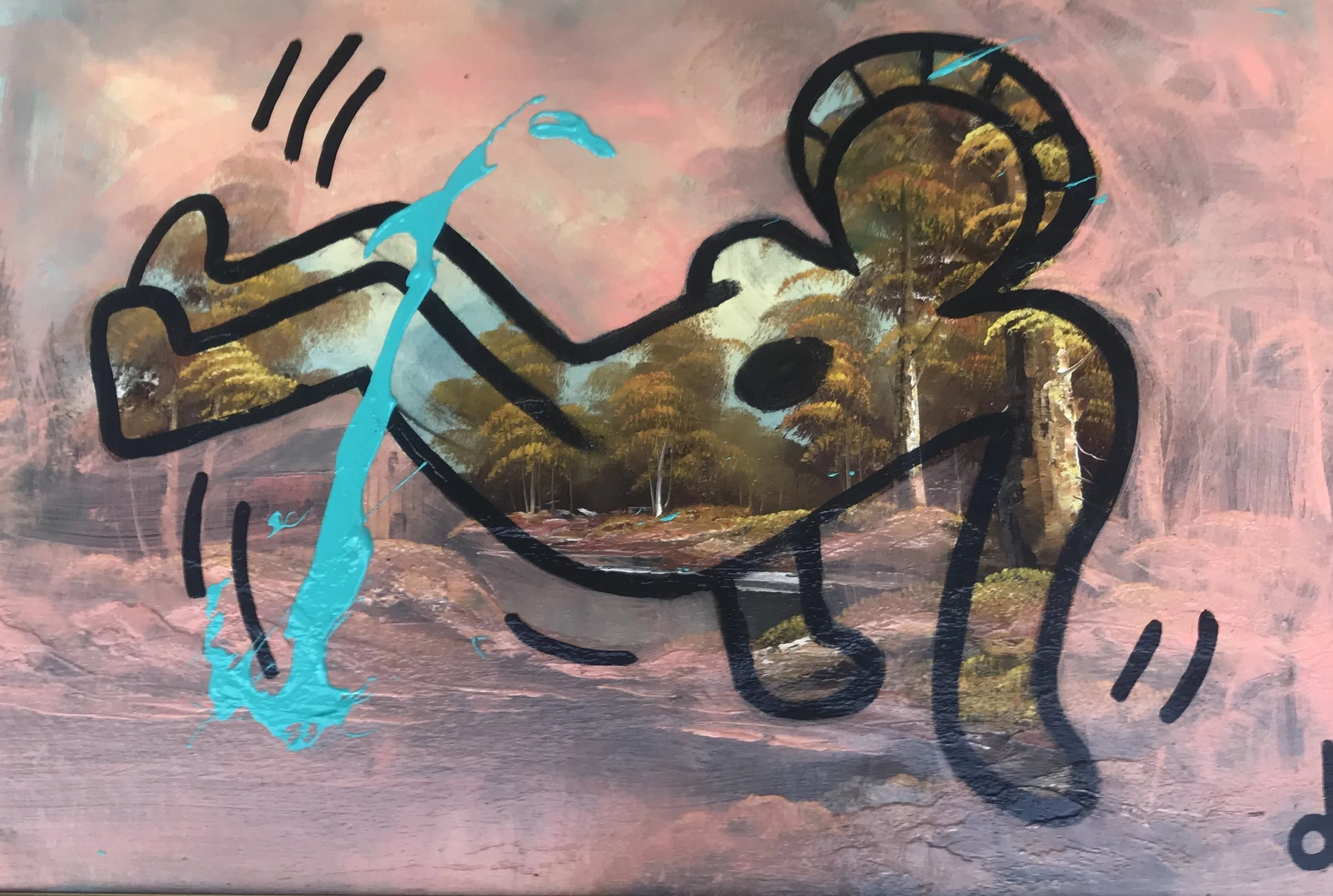 Spray paint, acrylic and daub on original landscape painting