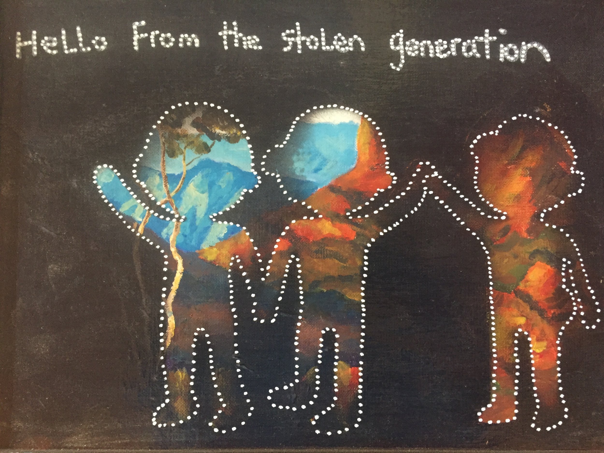 In this work, Armstrong cuts three child-like silhouettes from a colonial landscape, allowing the scenery behind them to fill their bodies like ghosts of Country. Each figure is edged with delicate white dotting — a visual echo of First Nations mark-making — and together they form a small procession waving toward the viewer beneath the hand-painted message, “Hello from the stolen generation.”