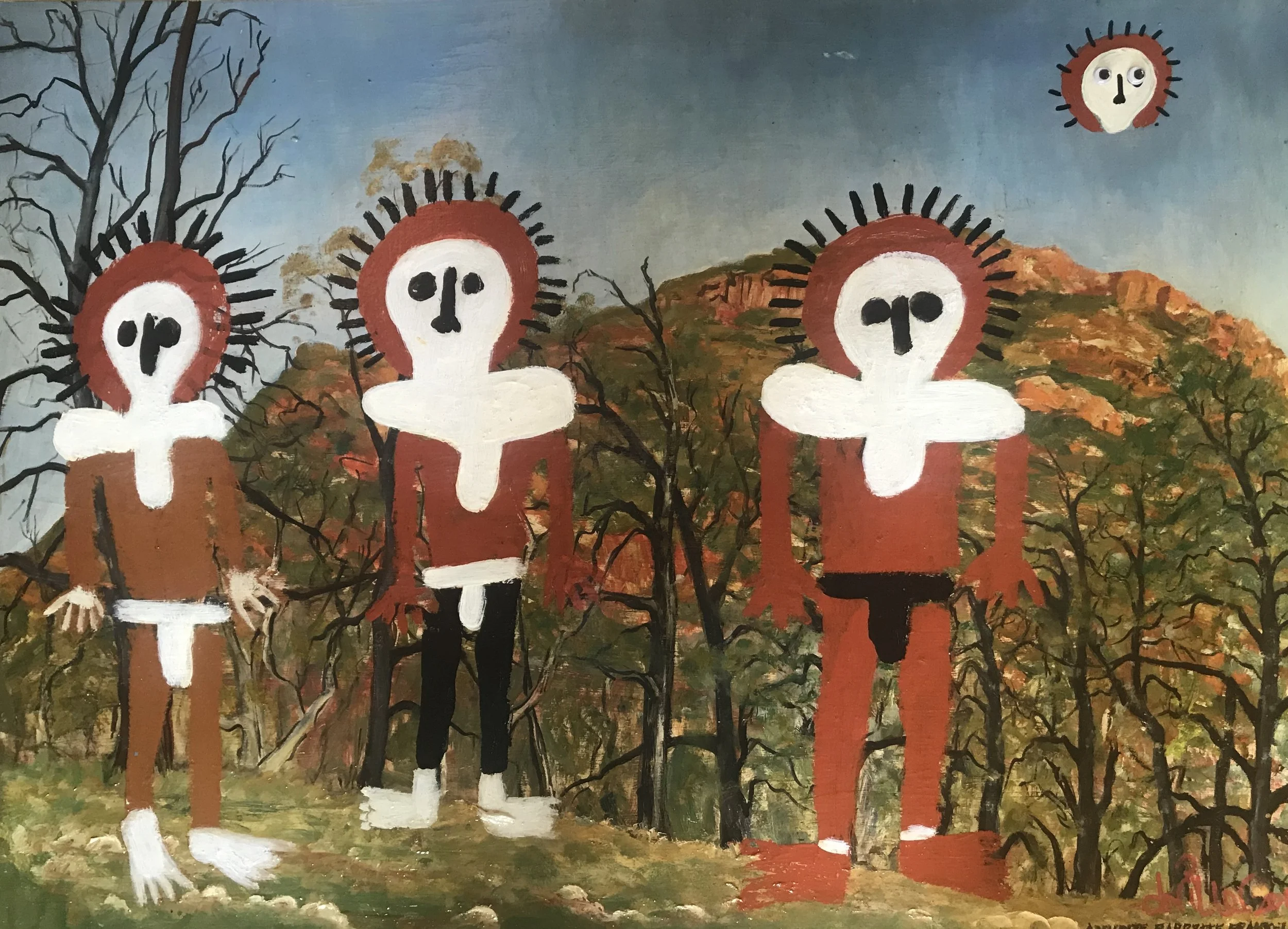Space Invader is one of the clearest articulations of Daubism’s central tension: the collision of imported visual languages with the deep time of Country. Painted over a sentimental European-style landscape, the white figure appears simultaneously ancient and extraterrestrial — part Wandjina, part arcade-era alien, part warning flare in the wilderness.