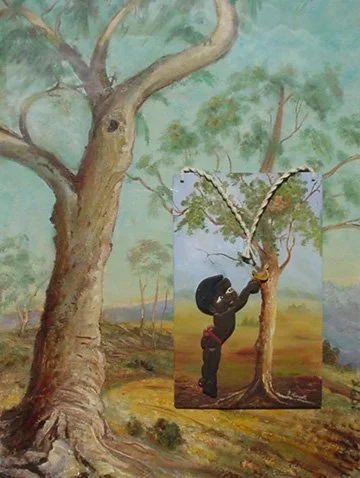 Within this newly-constructed space, a stylised Black child appears to be gathering bark from the tree — a gesture borrowed from one painting and inserted into the other without alteration. Driller adds nothing; he simply combines what was already present. This act of joining exposes the ways in which Australian landscape painting has historically erased, sentimentalised, or misrepresented First Nations people.