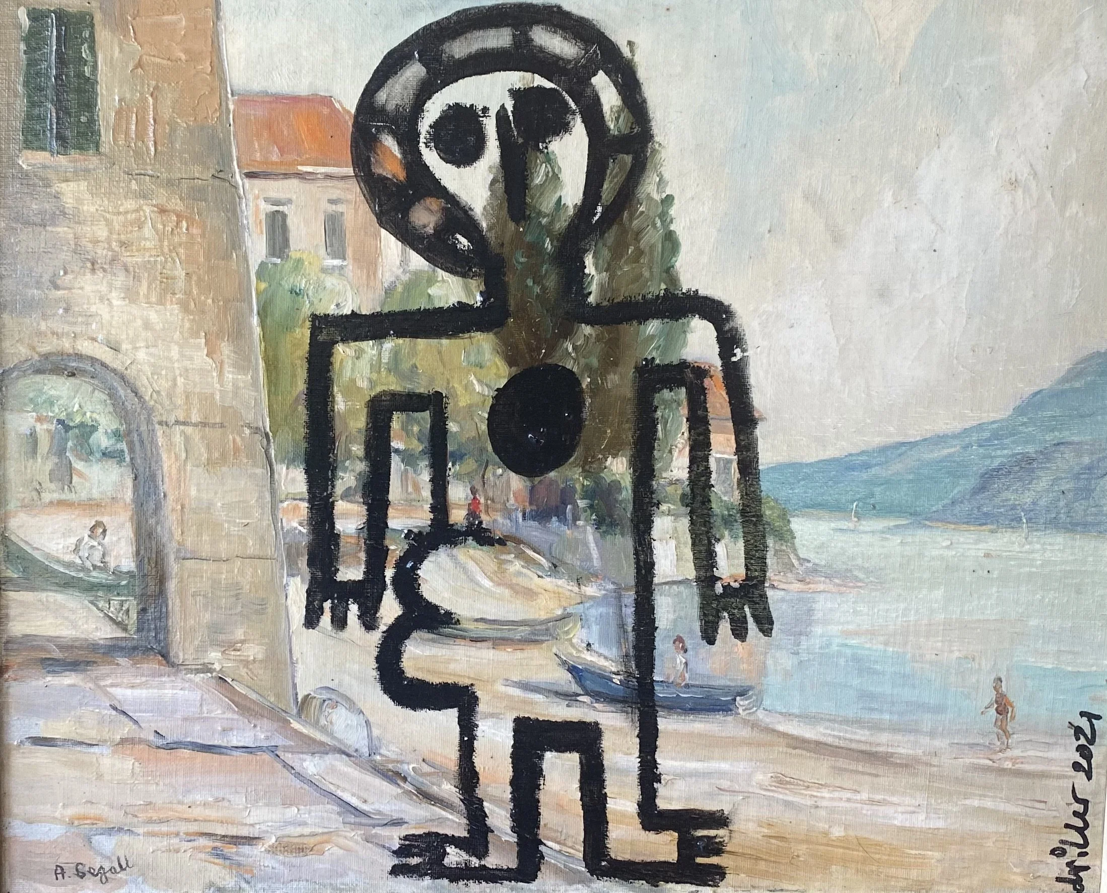 Painted Wandjina figure on an original European landscape painting by A. Segall.
