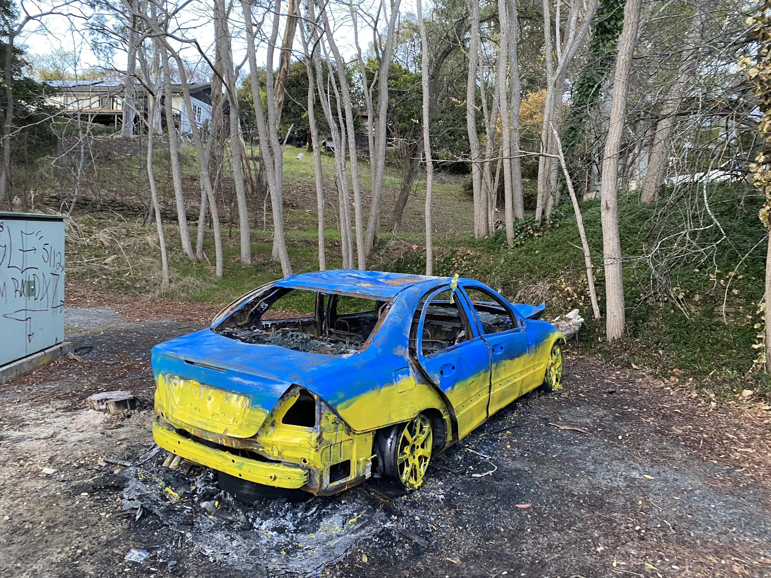 On the night of 23 May, under the cover of darkness, a small crew of friends and neighbours joined me in a spontaneous act of public repair and political expression. We painted the burned-out car in the bold blue and yellow of the Ukrainian flag—a gesture of solidarity with Ukraine during the Russian invasion, and a message of moral support for its citizens.