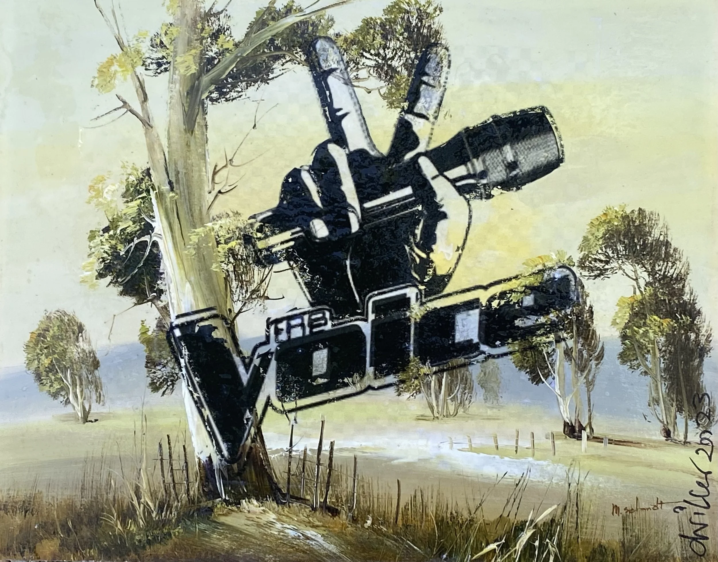 Voice takes the glossy, hyper-commercial logo of the TV show The Voice and rips it out of entertainment culture, repurposing it as a symbol of Australia’s 2023 referendum — a moment when a nation was asked a simple question but revealed a complicated soul.