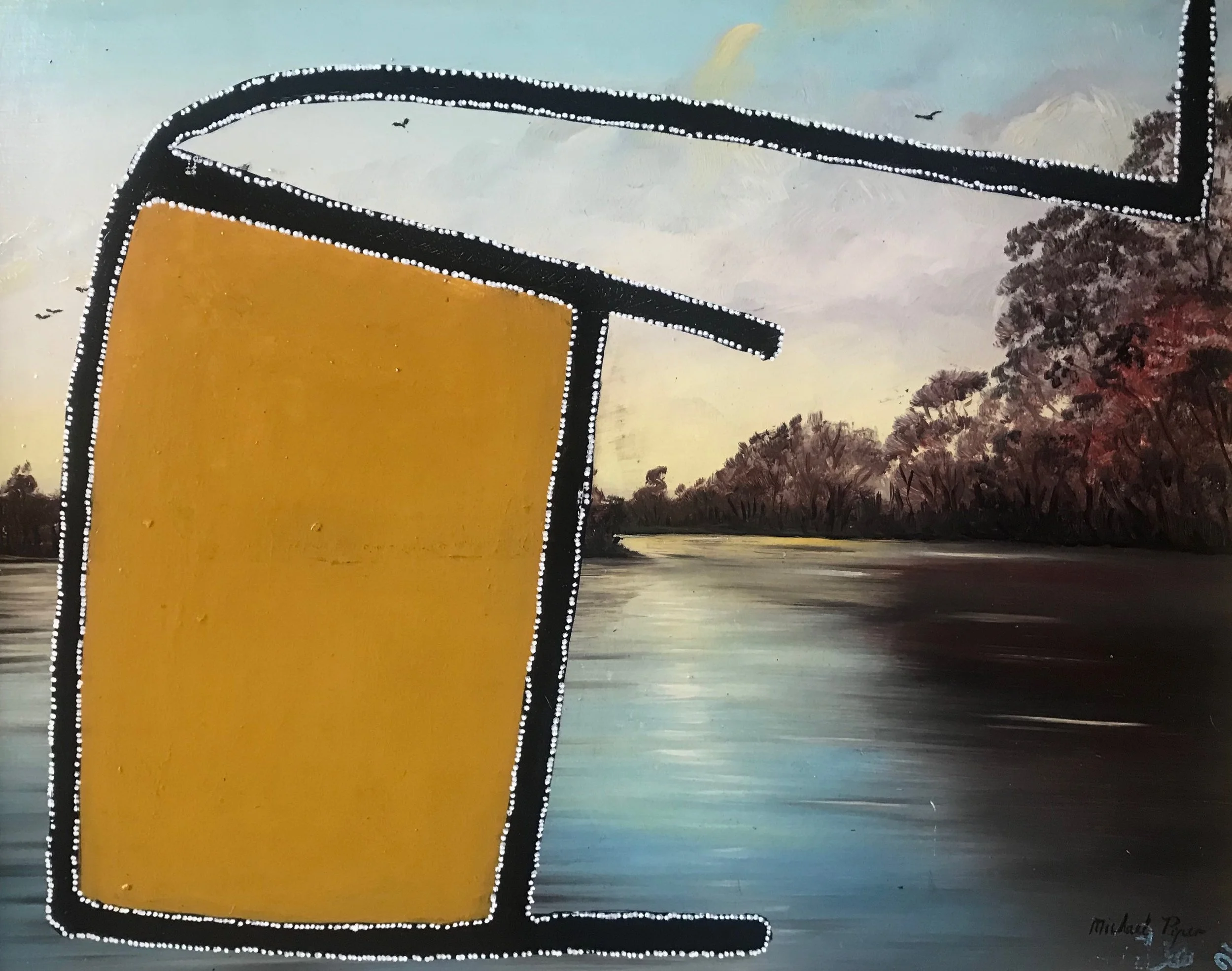 In Welcome to Country, Armstrong overlays a calm river landscape with a bold, geometric form edged in dotted linework—a direct and reverent nod to one of his most influential favourite First Nations artists, Rover Thomas. By imposing this powerful visual language onto a colonial landscape painting, Armstrong stages a deliberate cultural collision: Rover Thomas’s Country pushed assertively over the top of a sentimental settler fantasy.
