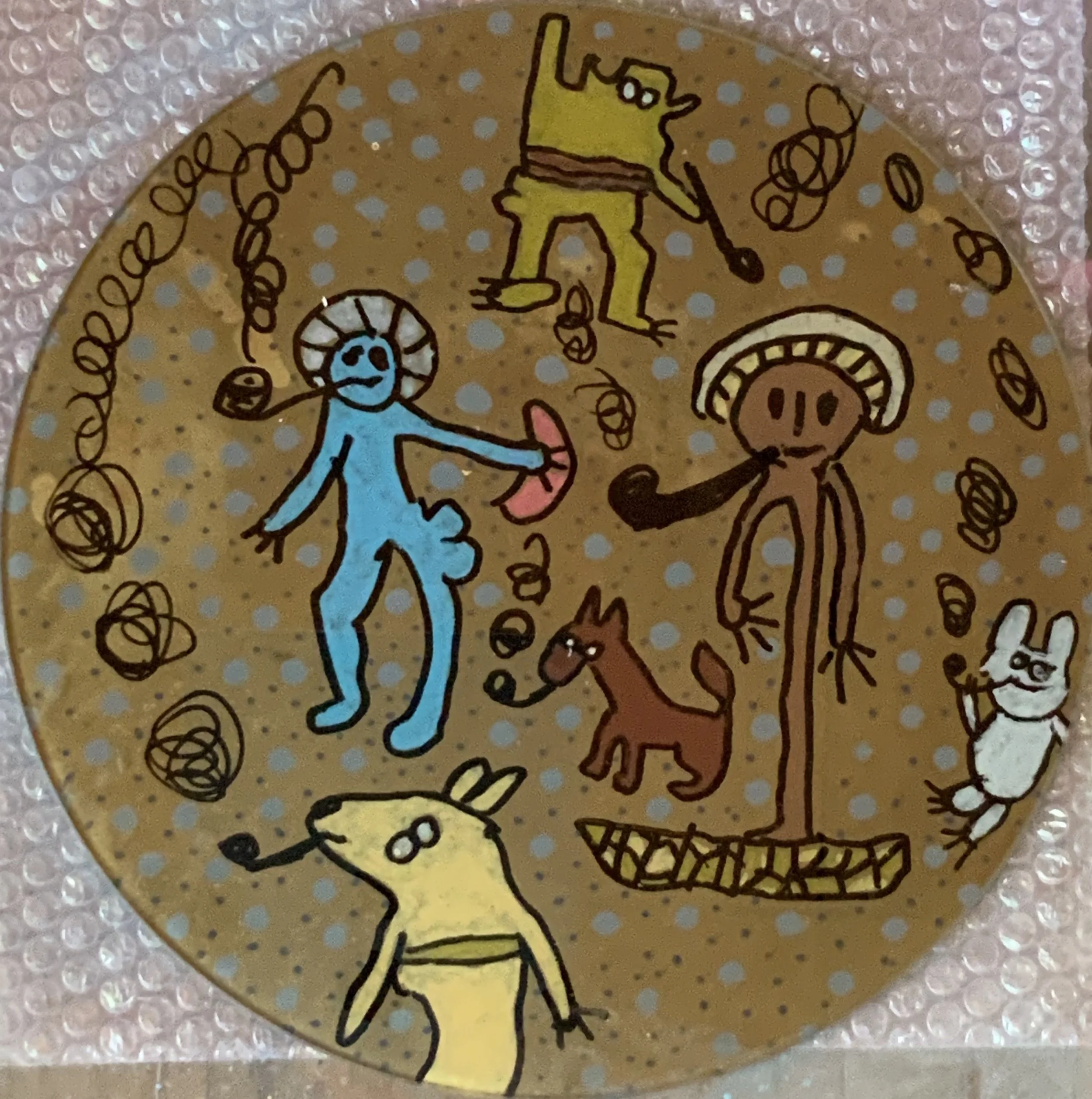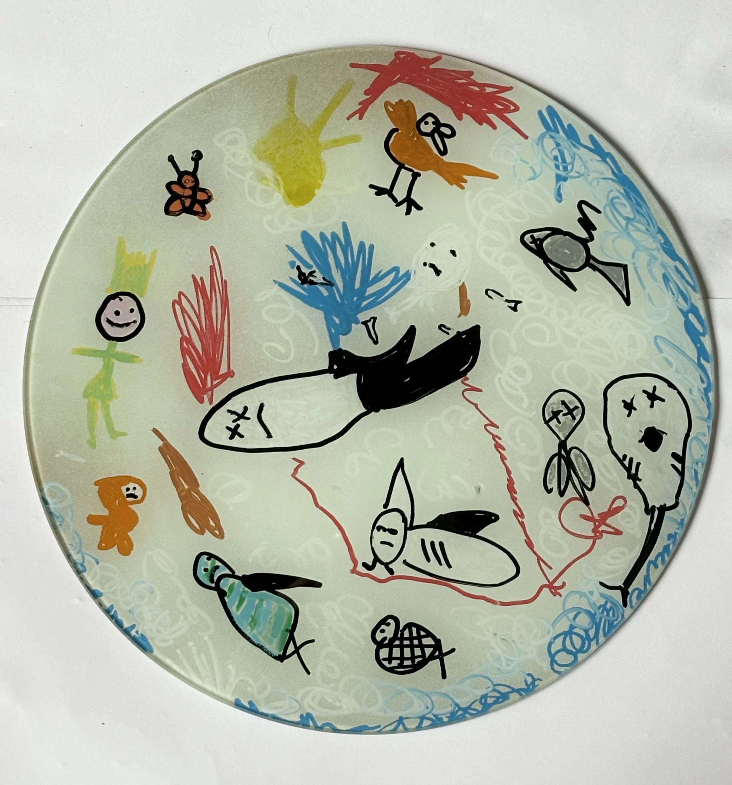 Paint marker on 30cm glass disc — image stolen from the children’s art page of the local Sunday paper