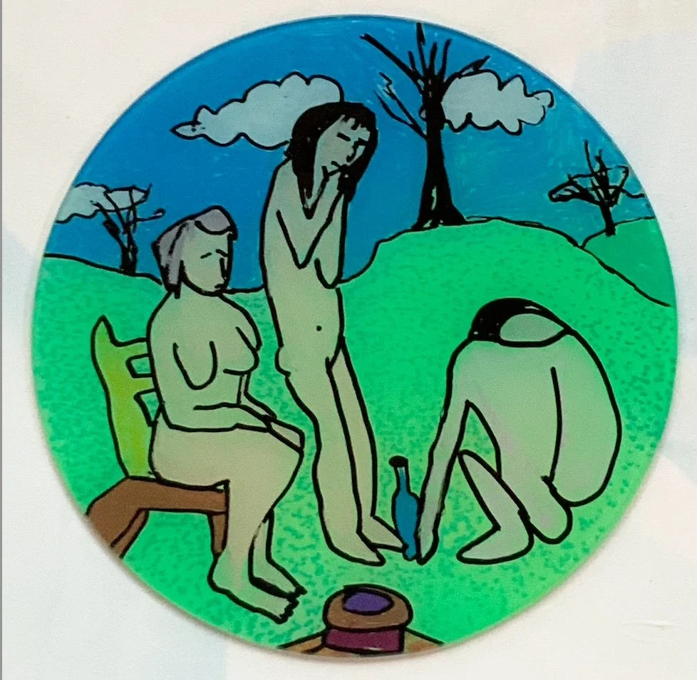 The glass disc format flattens the scene into a glowing, iconic emblem, while the thick, gestural line work gives the figures a raw, immediate presence. Although the imagery nods to art history, the tone is entirely Armstrong’s: playful, ambiguous, gently irreverent. The original “pastoral nude” becomes a site of interruption—humour and critique wrapped together in a single, bold silhouette.