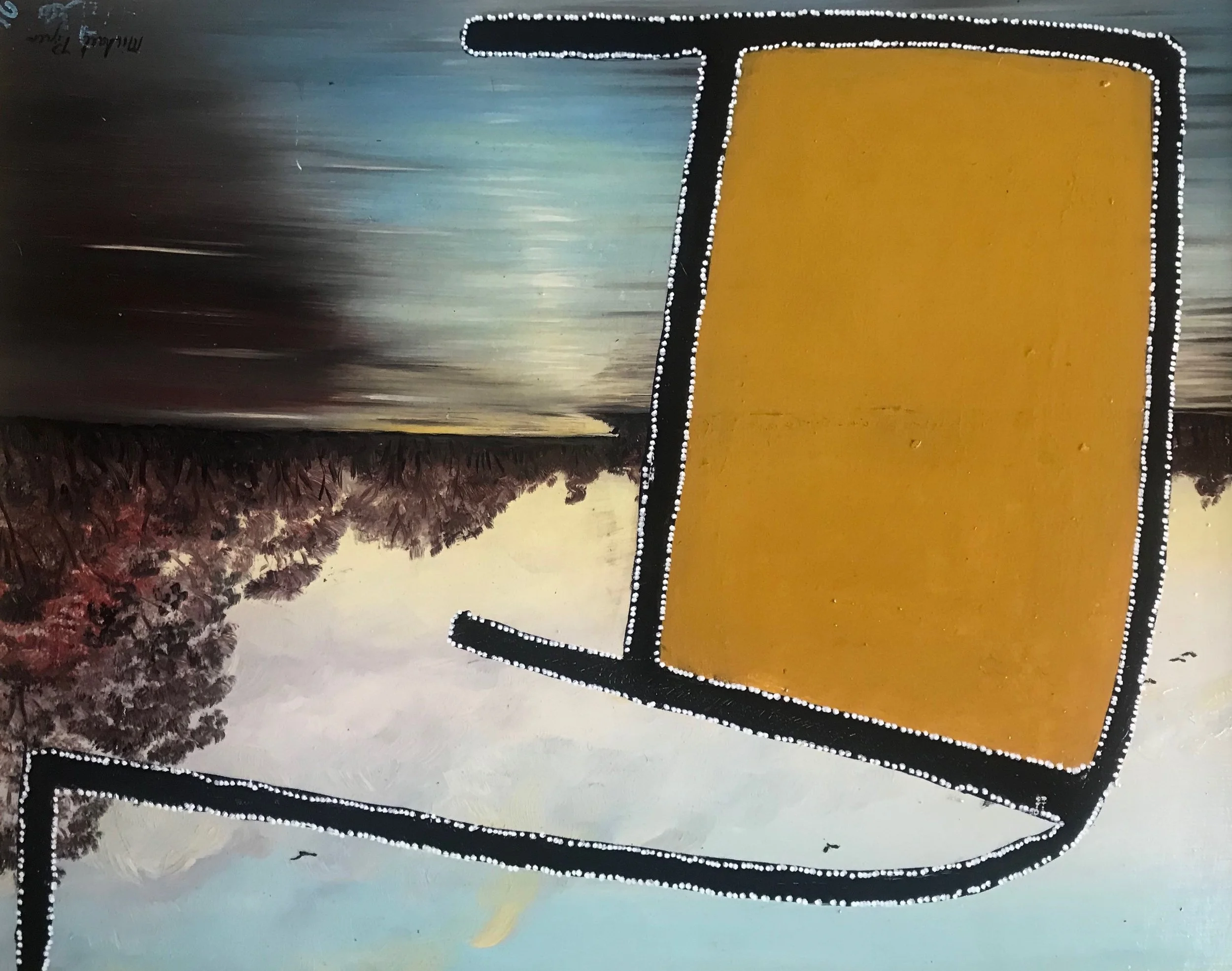 In this sharply humorous Daubist intervention, a serene European riverside scene becomes the unlikely stage for a bold Antipodean arrival. Armstrong overlays the inherited landscape with a stark, glyph-like figure—part traveller, part ancestral echo—interrupting the borrowed idyll with unmistakable Australian presence. The work playfully critiques colonial narratives of “arrival” by reversing the gaze: here, Europe becomes the backdrop onto which Australia projects itself.