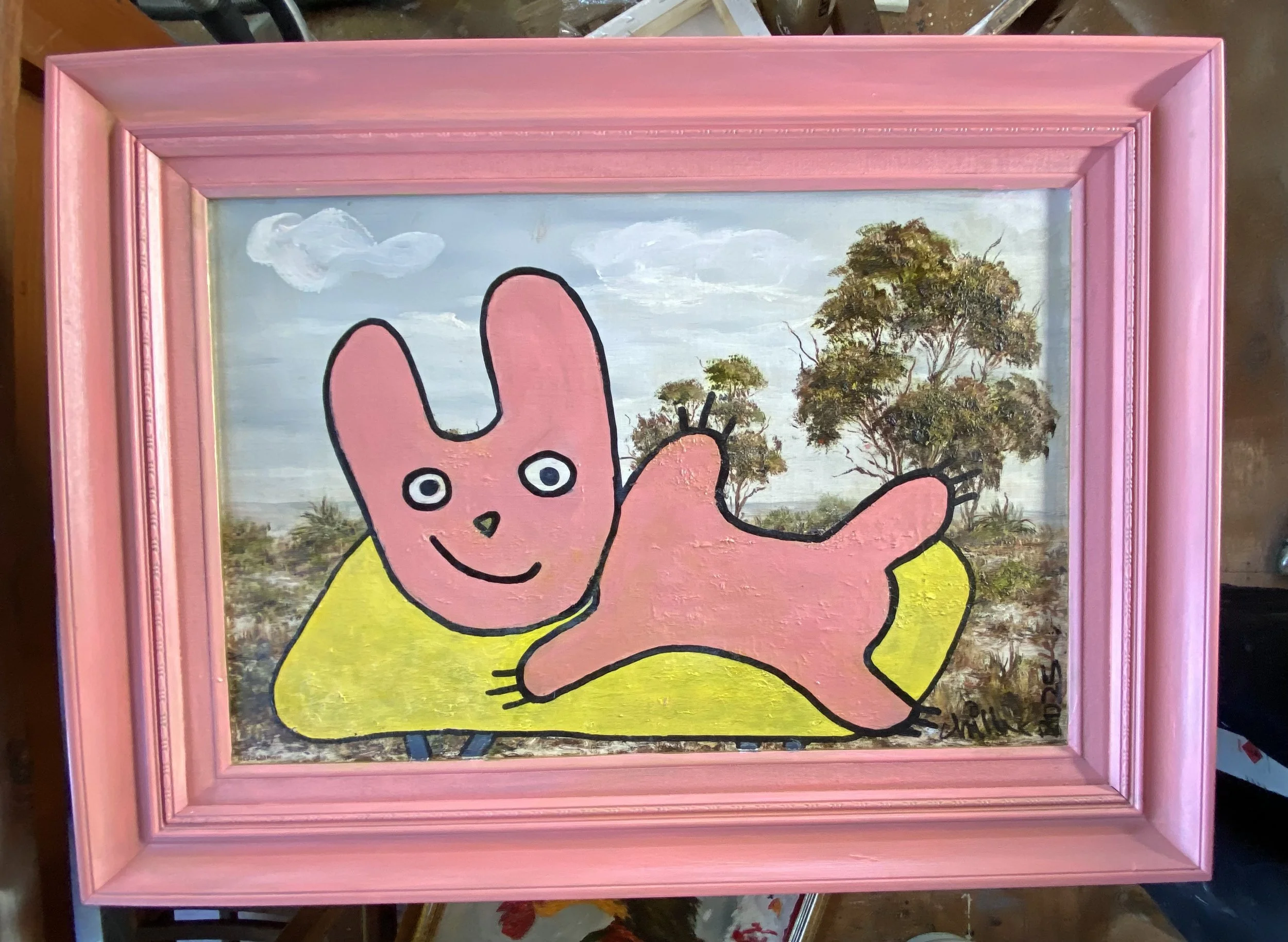 Set against the polite eucalyptus bush scene, the pink figure reads as both intruder and heir: a soft, cartoon body sprawling across the authority of inherited landscape painting. High and low culture blur. Public art becomes private painting. Memory becomes material.