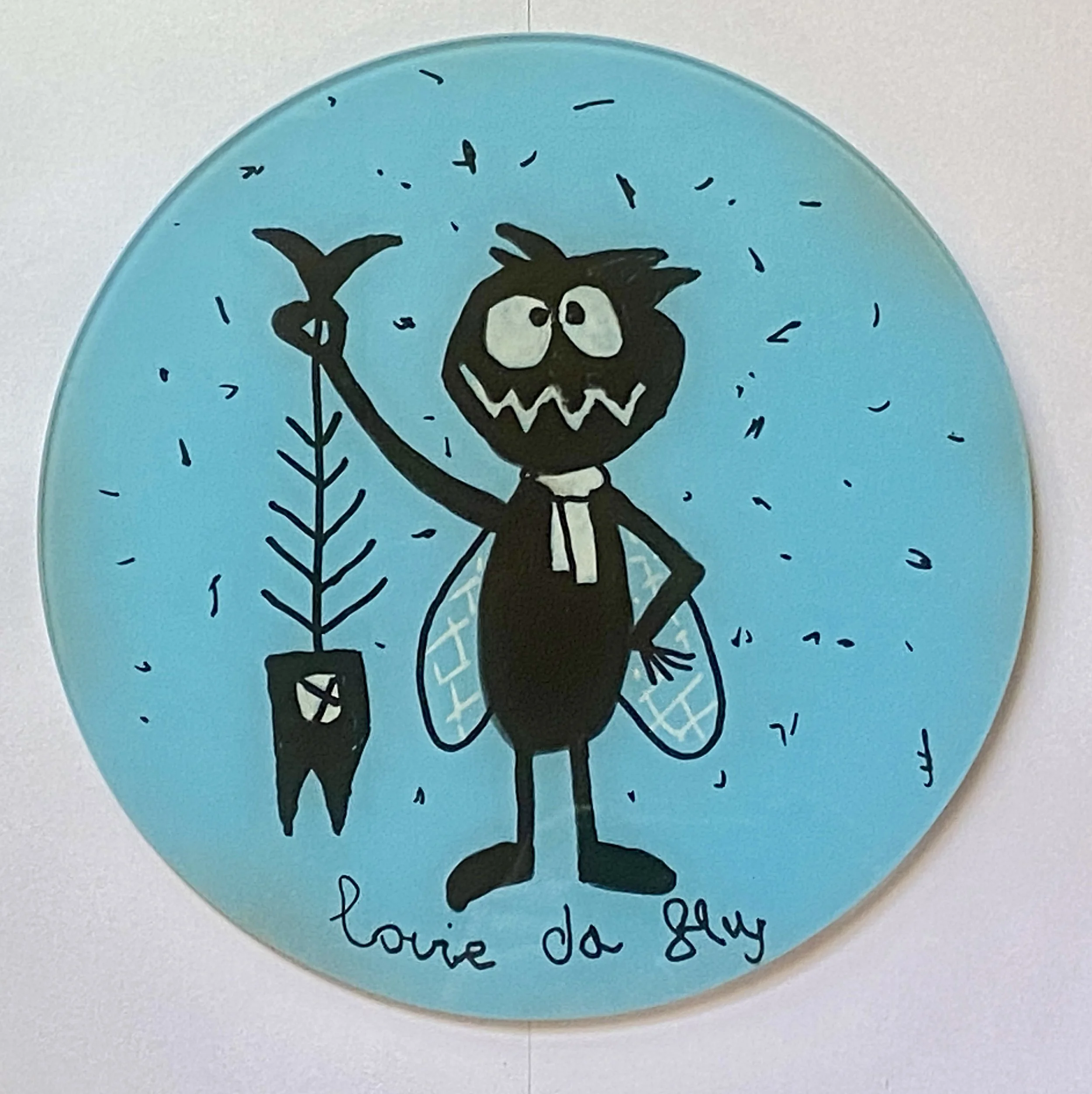 A cheeky homage to the long-running Australian cultural icon, Louie the Fly—reimagined through the Daubist lens. Painted onto a vivid aqua glass disc, the figure stands proudly with a ragged fishbone trophy, equal parts punk, pest, and folk hero.