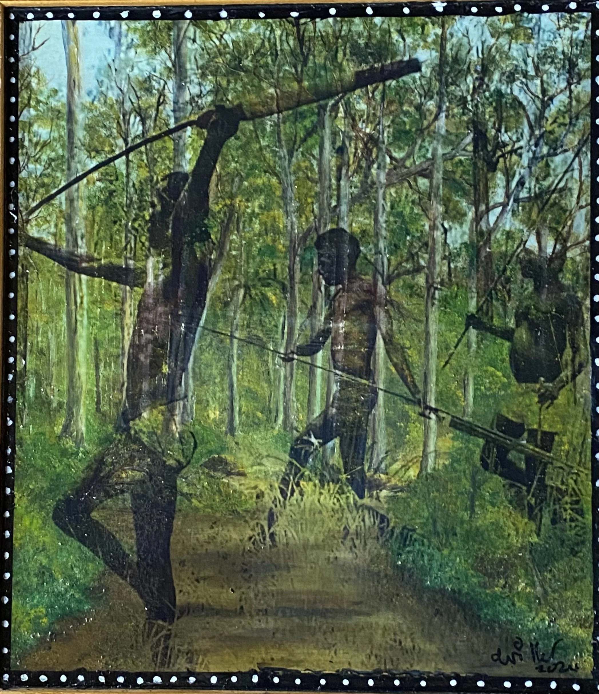On Country marks one of the most incisive moments in the evolution of Daubism’s ongoing confrontation with the colonial landscape tradition. Using gel-transfer techniques, Driller Jet Armstrong overlays three Aboriginal hunters across an inherited pastoral scene, not as ghosts or “insertions,” but as rightful presences returning to a country from which they were historically painted out.