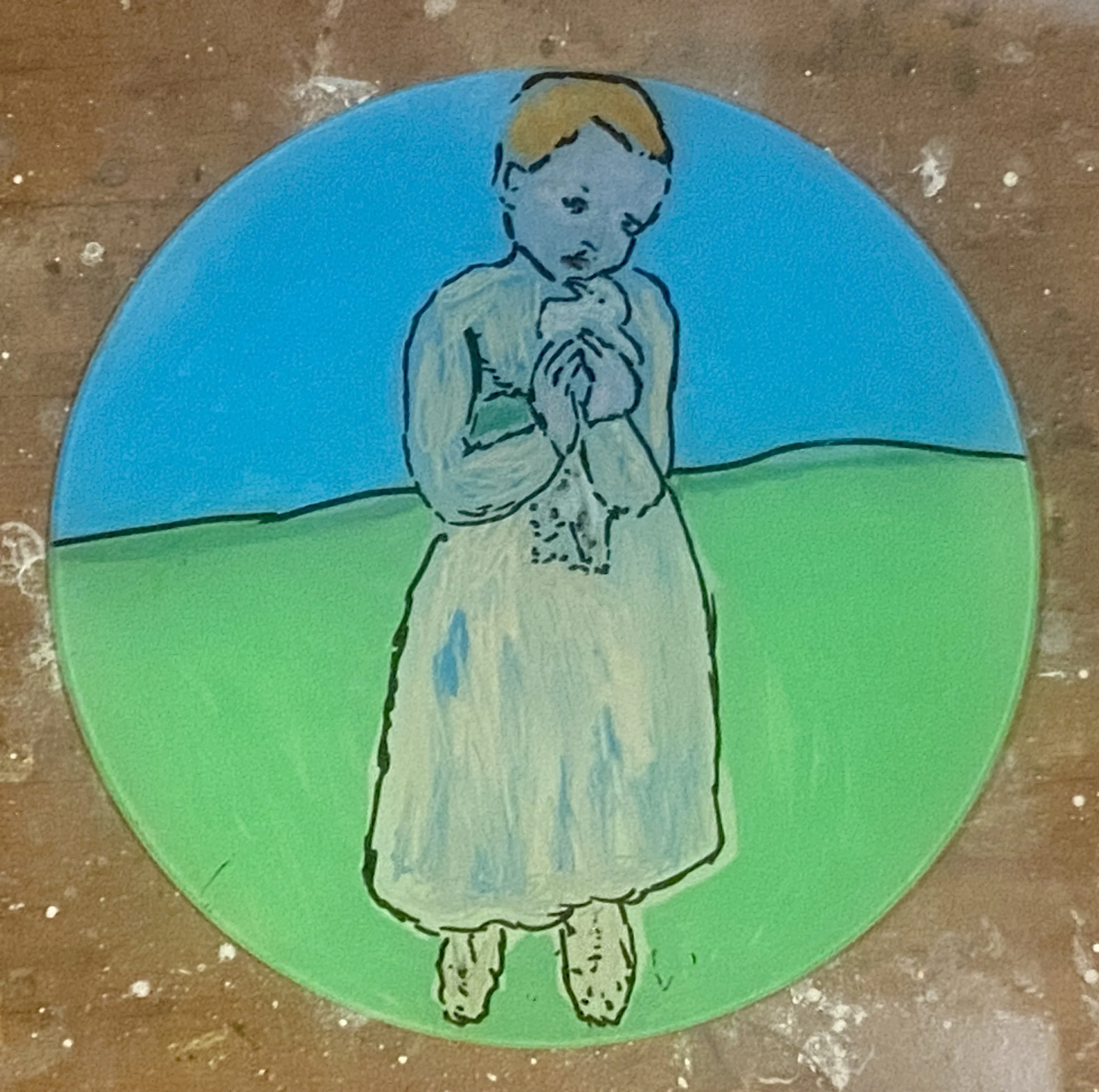 Referencing Pablo Picasso’s 1901 masterpiece Girl with a Dove, Driller reinterprets the Blue Period icon through the luminous, floating medium of painted glass. The original’s melancholic palette and tender symbolism are distilled into a simplified, almost devotional outline — a Daubist re-drawing that removes sentimentality and emphasises structure, contour, and presence.