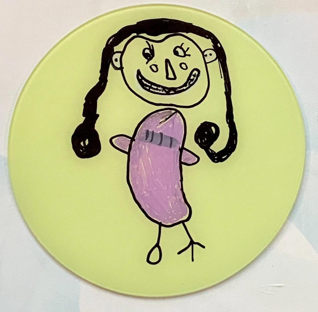 “Amelia” continues Driller’s long Daubist tradition of lifting imagery from the most unlikely of sources and granting it new agency. A child’s drawing — exuberant, wonky, and utterly unselfconscious — is transplanted onto a luminous glass disc, where it becomes both a celebration of unfiltered creativity and a gentle critique of how images circulate, are consumed, and are constantly recontextualised.