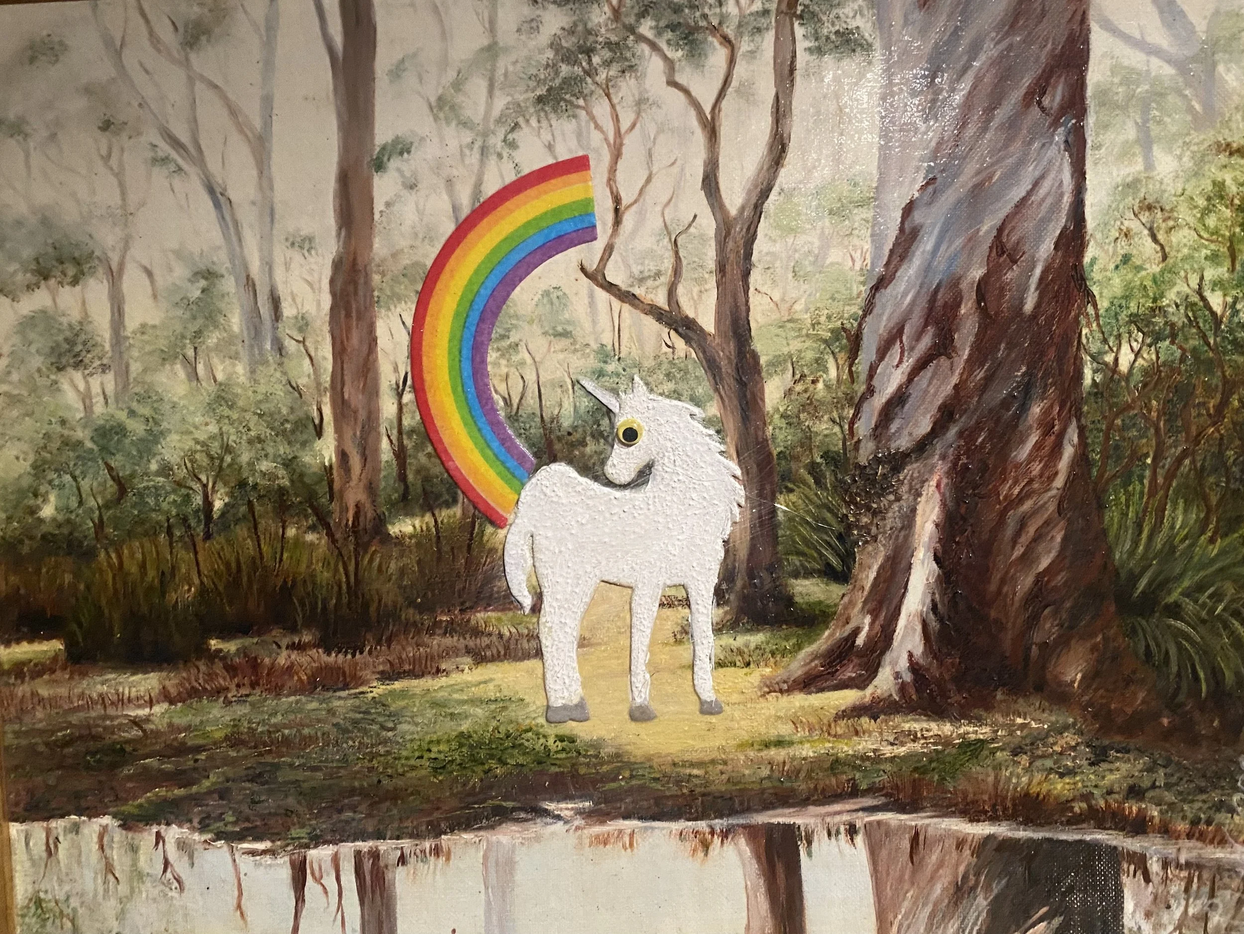 In this key work from the Unicorn Felt Series, Driller Jet Armstrong inserts a pop-culture mythological creature directly into the Australian bush — then gives it permission to behave exactly as the internet insists it must. The unicorn stands by a quiet billabong, framed by earnest colonial-era trees, and casually releases a rainbow into the landscape.