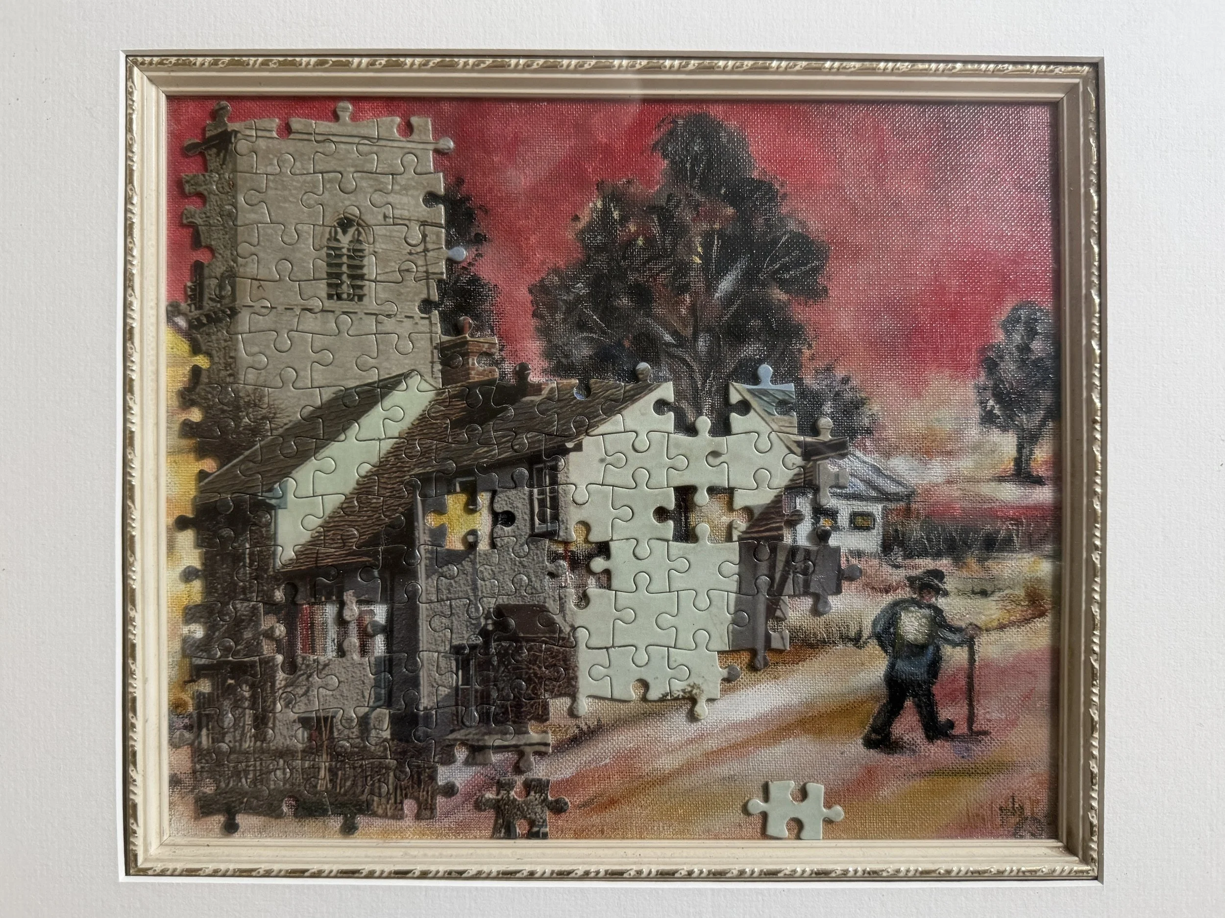 Leaving Puzzleton captures a moment of quiet departure from a world still unfinished. A lone figure walks away as structures dissolve into puzzle pieces—some fitted, some missing—suggesting a place held together by memory, habit, and partial understanding. The Daubist approach blurs certainty, allowing the image to exist between completion and collapse.