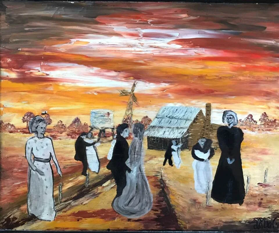 In The Bachelor and Spinsters Ball, Driller Jet Armstrong transplants a cast of spectral Edvard Munch figures into the brittle calm of an Australian rural landscape, collapsing two cultural worlds—Expressionist anxiety and outback stoicism—into a single, uneasy tableau. Originally painted as a benign bush scene, the landscape becomes a stage for emotional dissonance as these elongated, haunted visitors drift through the dust like misplaced guests at a country dance.