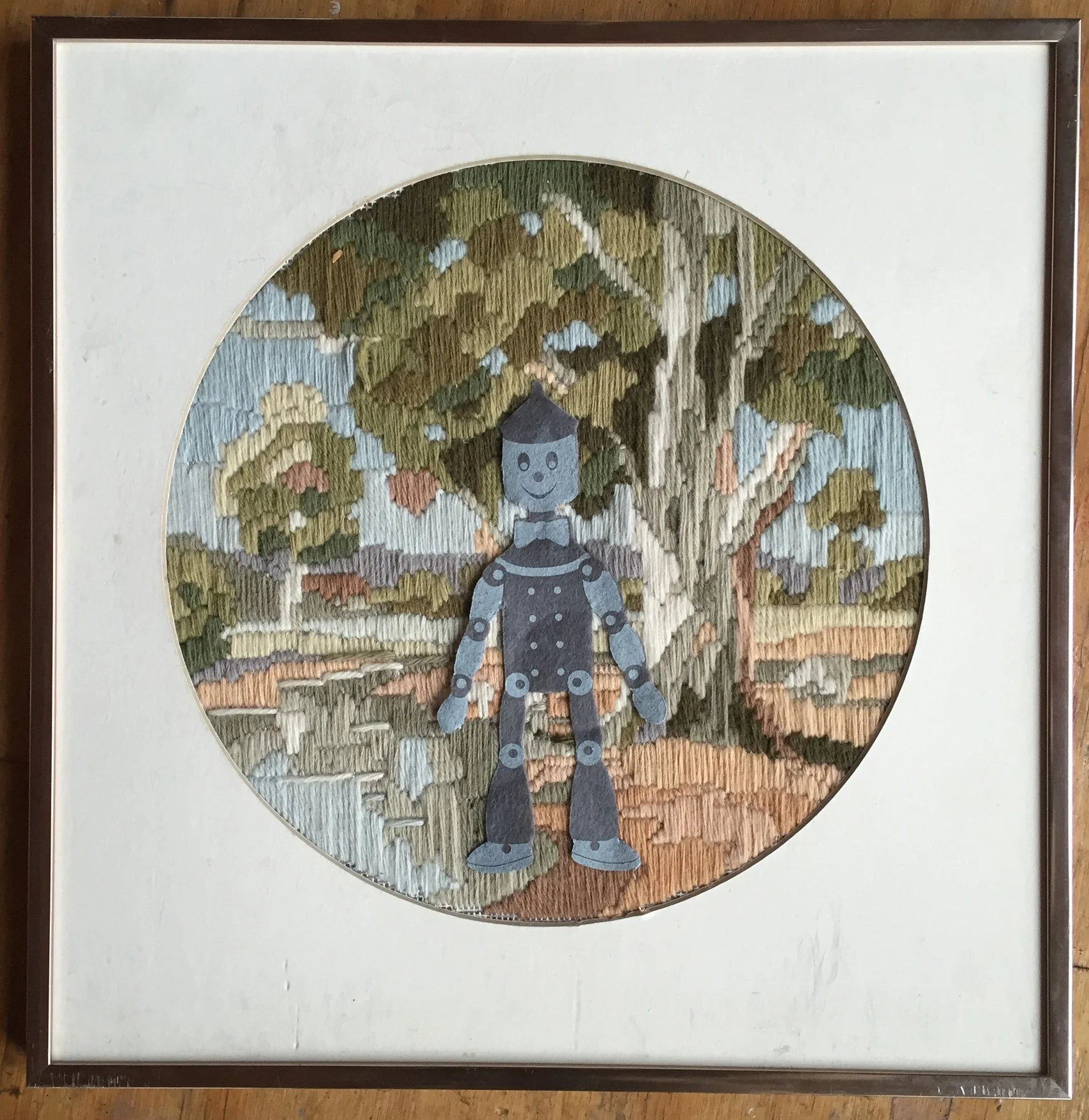 A rescued embroidered landscape — patient, nostalgic, handmade — forms the ground: the kind of pastoral image once stitched slowly at a kitchen table, a vision of nature filtered through memory and tradition. Into this soft, inherited world the artist inserts a small felt figure, part toy, part tin man, part rudimentary robot.